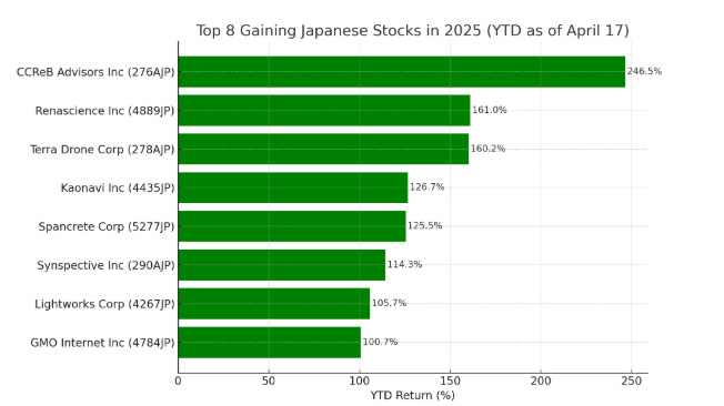 These eight names—all listed on the Tokyo Stock Exchange—have each doubled or more in share price year-to-date, with exposure ranging from biotech to fintech and construction.