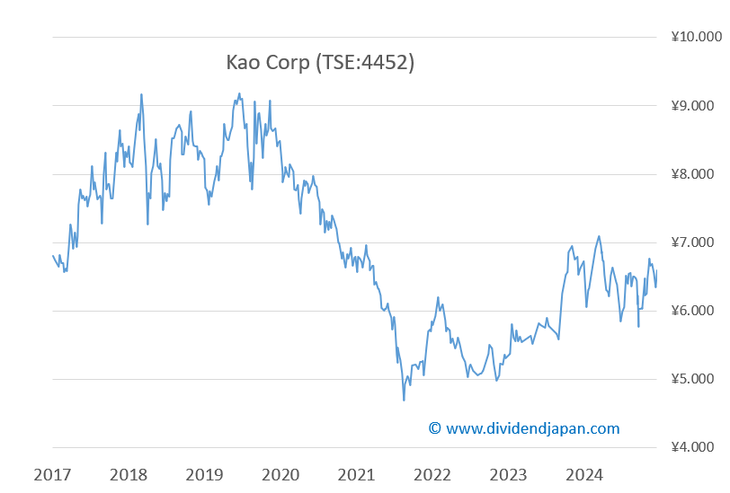 Kao raised its dividend this year for the 35th consecutive time, though the increase was minimal—just 1.3%, bringing the total to 152 yen. Compared to other Japanese Dividend Aristocrats, this is quite low, especially with Kao’s 5-year dividend CAGR sitting at only 3.2%.