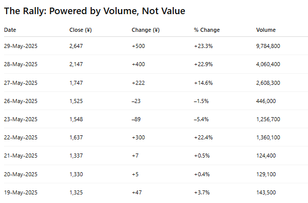 After crashing from a January high of ¥6,600 to a low of ¥1,000 in April, the stock is now roaring higher again, closing at ¥2,647 on May 29. That’s a 100%+ surge in under two weeks, with daily limit-up moves and exploding trading volumes… all with zero material news.