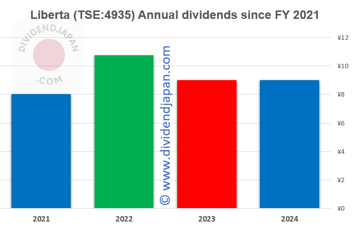 Despite growing sales (¥8.64B in FY2024, +22% YoY), Liberta cut its dividend two years ago