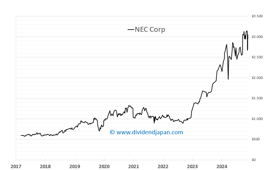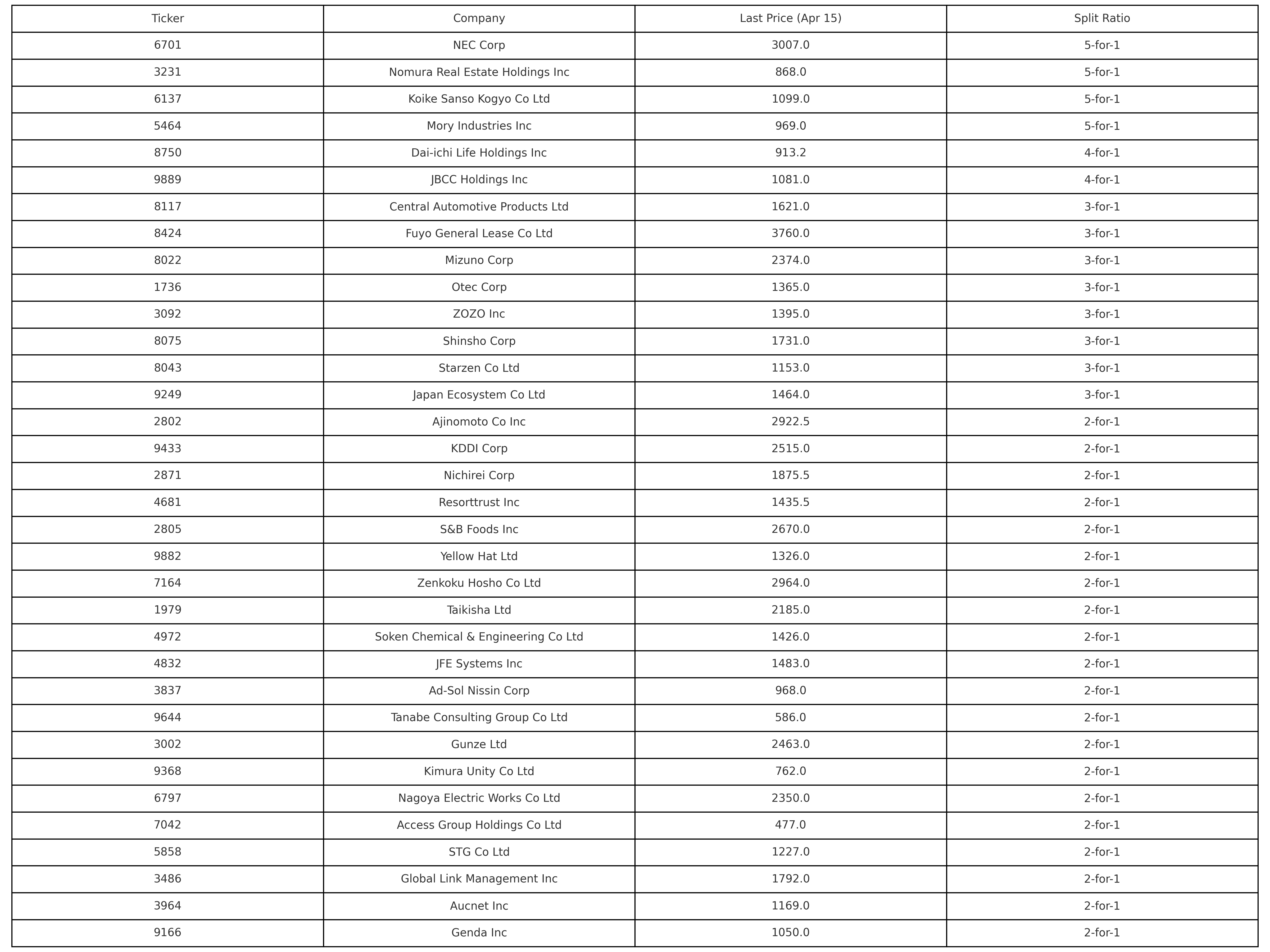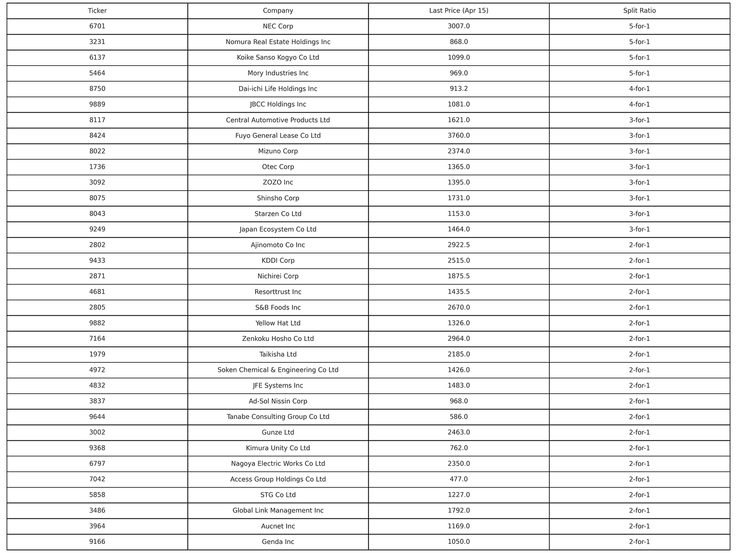 This is exactly what we saw in late March. For instance, NEC Corp (ticker: 6701) split its shares 5-for-1, bringing its post-split share price down to a more accessible level from ¥3,007. Similarly, Koike Sanso Kogyo (6137), Mory Industries (5464), and Nomura Real Estate Holdings (3231) each executed 5-for-1 splits, while Dai-ichi Life Holdings (8750) chose a 4-for-1 ratio. Other major names like Ajinomoto (2802) and KDDI Corp (9433) went for 2-for-1 splits, significantly reducing the capital needed to enter a position in those stocks.