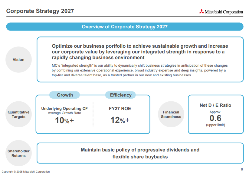 We will maintain our basic policy of progressive dividends and flexible share buybacks. (source: Mitsubishi Corporate Strategy 2027 presentation)